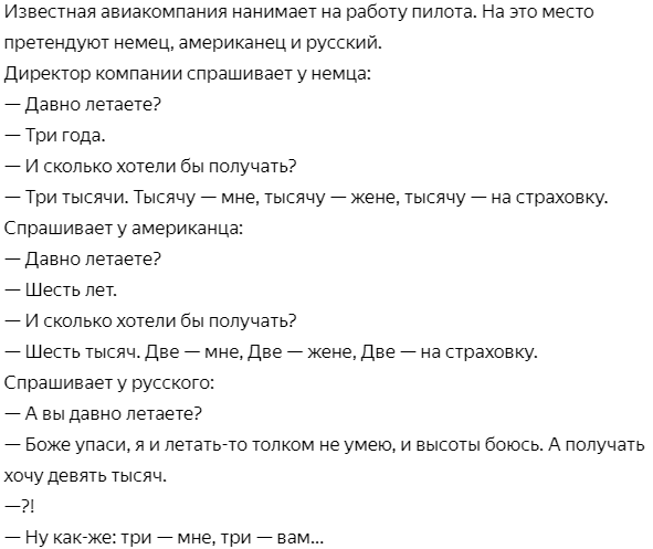 Анекдот: Попадают в чистилище русский, американец и немец. Бог им и говорит: — Кто скажет мне число, которого я не знаю, попадет