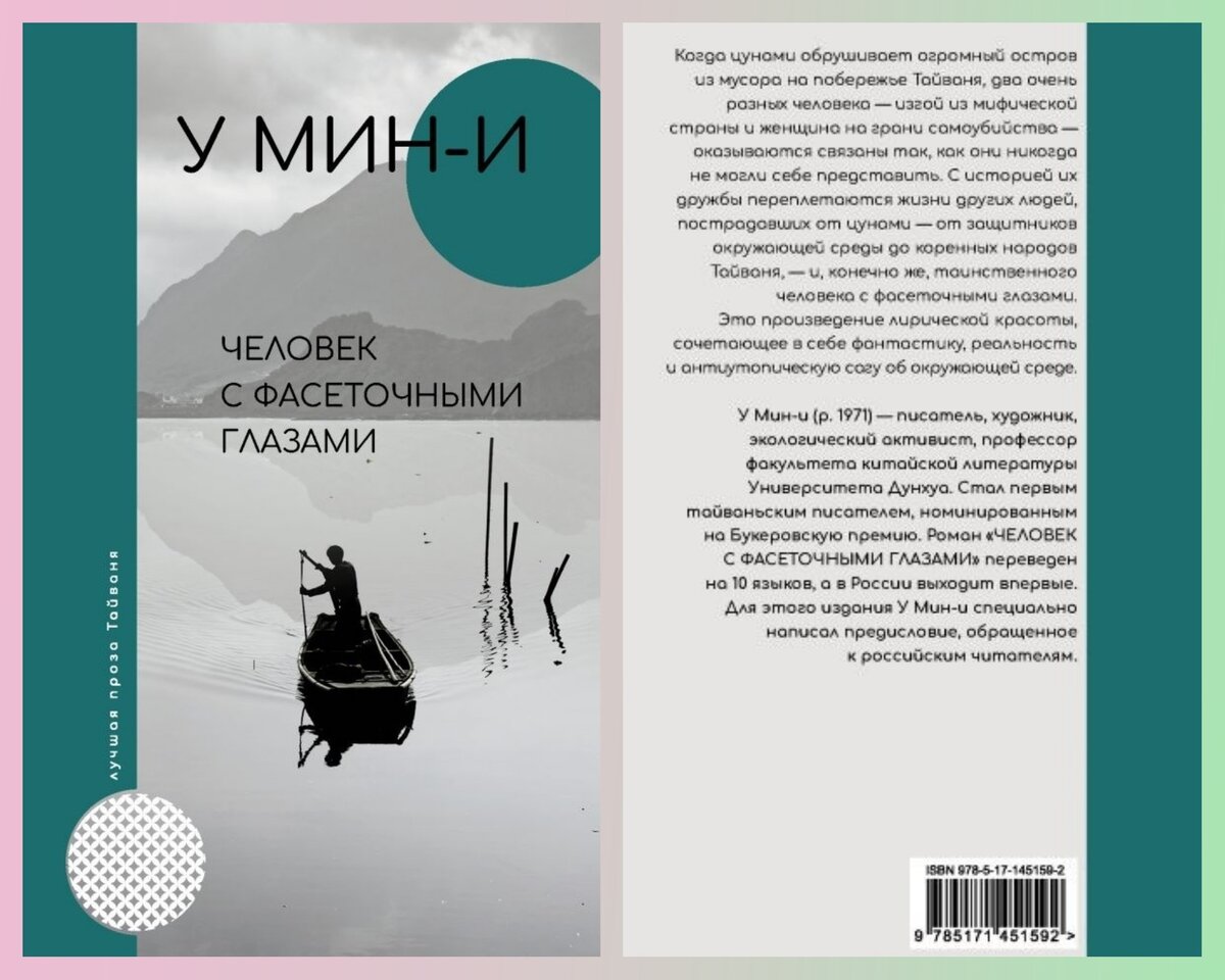 Небольшая справка о произведении от издателя: "Экологическая притча «Человек с фасеточными глазами» (2011) была переведена на английский и опубликована 29 августа 2013 года издательством «Harvill Secker», французский перевод вышел в «Éditions Stock» в 2014 году, затем появились переводы еще на 10 языках, включая русский. Это история юноши с тихоокеанского острова Ваю-Ваю, который попадает на восточное побережье Тайваня. Роман назвали «шедевром эколитературы на тему апокалиптического столкновения „естественного человека“ с эпохой модерна. Загрязнение, нехватка ресурсов и, как следствие, разрушение побережья Тайваня стали результатом недальновидного эгоизма, что ярко показал У Мин-и в своём произведении»."