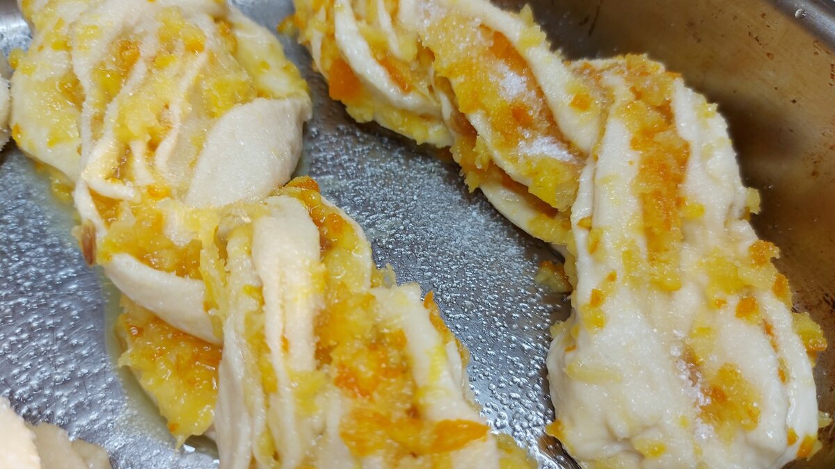 Тесто раскатываю, выкладываю варенье из цитрусовых корок и скручиваю в рулет заготовку. Разрезаю вдоль и скручиваю концы. Если вам непонятен процесс, советую посмотреть видео и собственными глазами увидеть как это делаю я. Лучше один раз посмотреть, чем 100500 раз прочитать.