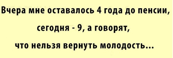 Хочу чтобы тех, кто предлагает повысить пенсионный возраст, возил 65-летний водитель после микроинсульта, а капельницу в вену вставляла 63-летняя подслеповатая медсестра. *** - Почему в России пенсионный возраст для мужчин хотят поднять на 5 лет, а для женщин - на 8?