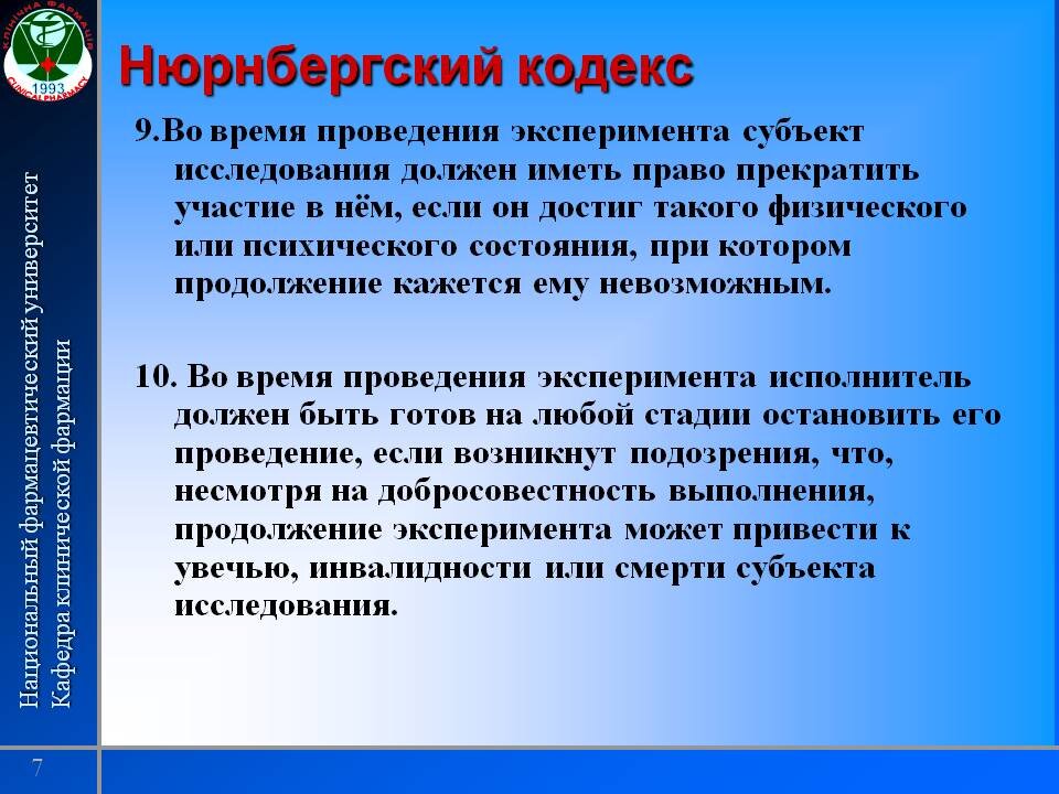 6. Степень риска, связанного с проведением эксперимента, никогда не должна превышать гуманитарной важности проблемы, на решение которой направлен данный эксперимент.