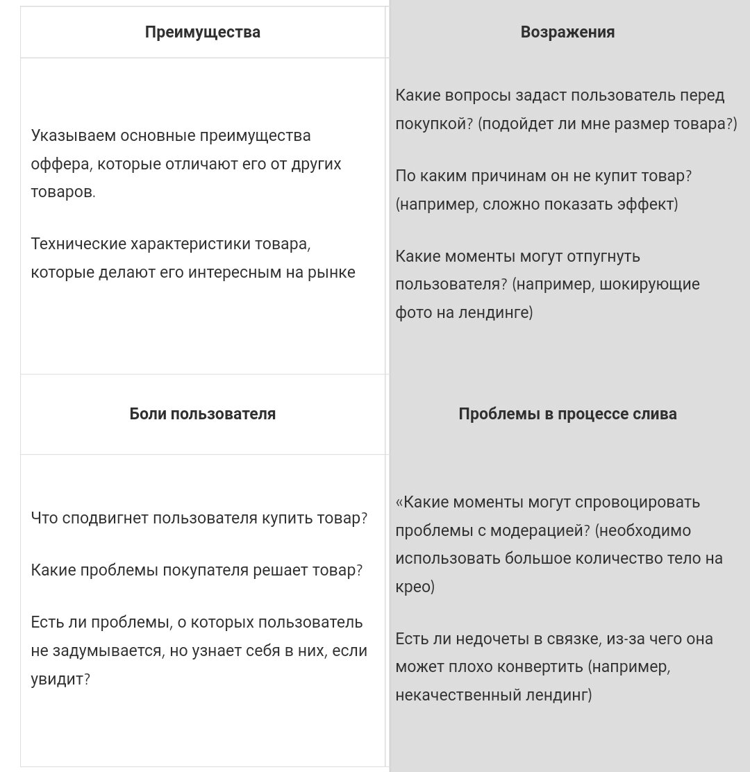 Чтобы провести анализ оффера, мы предлагаем использовать SWOT-анализ. Этот анализ поможет выделить основные преимущества, боли и проблемы оффера. Адаптированная под особенности whitehat-товарки таблица: На основе полученных данных создается матрица SWOT-анализа. Этих данных достаточно, чтобы при создании креативов опираться на уникальную информацию, а не на шаблонные идеи и тексты.