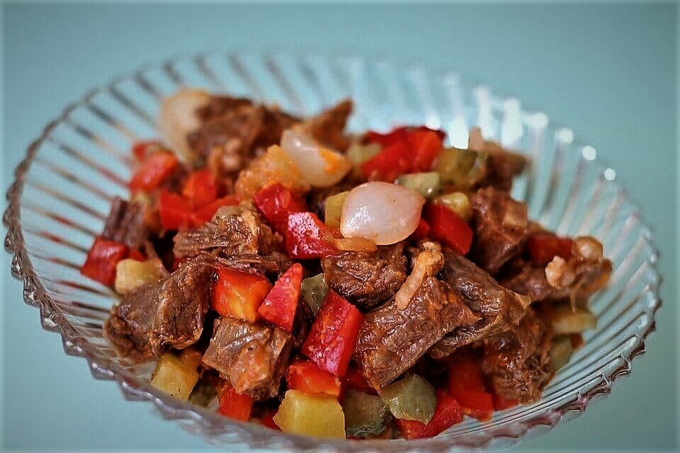 -Ты только осторожно пробуй, а то весь рот себе сожжешь, — предупредили меня как-то в гостях и угостили этим салатиком. Рот себе не сжег (я вообще люблю острое, хоть сейчас и нельзя его в диету включать), а рецепт салата утащил. Он сытный, остропряный с легкой «сладинкой», если можно так выразиться, приятно пикантный, ну и еще — очень несложный. Правда, не сезон для него сейчас — все-таки зимой больше на горяченькое тянет, однако, если вы не мерзнете, то почему бы и «дьявольским салатом» не побаловаться? Берем: Для заправки: Как готовим: Все ингредиенты заправки смешиваем в баночке, отставляем настаиваться. Говядину режем — полосками или кубиками, болгарский перец — кусочками, соответствующими по форме говядине. Свежий лук нарезаем мелким кубиками, а маринованный — можем четвертинками, а можем и целиком забросить — если он совсем мелкий. Огурцы режем либо полосками, либо кубиками — в общем, тоже под говядину, чтобы нарезка всех ингредиентов соответствовала друг другу. Все см