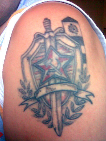 Во время моей службы в пограничном ОИСБ, среди солдат и сержантов было рапространено такое явление, как нанесение на разные части тела татуировок "на память". Вспоминаю, как, духами, мы приехали с пограничного учебного пункта на Балаклаву, и нас поразил, "неформальный" вид старших "товарищей", чьи тела в буквальном смысле, были украшены замысловатыми рисунками. Причем, преобладала некая религиозно-романтическая тематика. Например, группа дедов (так называемые "избранные"), сплотившихся, под началом врио командира взвода лейтенанта Пелиха, сделали себе татуировку в виде ангела восседающего на облаке и целившегося из лука - , что сие означало "райская жизнь на службе". Также встречались тевтонские и православные кресты, хищные птицы, драконы.
