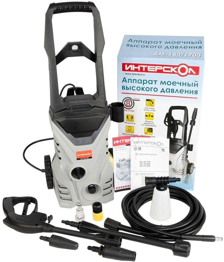 Аккуратная мойка высокого давления Интерскол АМ-140/1700, 140 бар с автоматическим забором воды и длинными шлангами (5 м.)