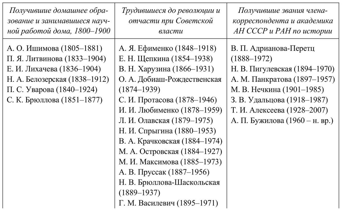 Ровесницам А. Я. Ефименко, особенно ее младшим коллегам, повезло больше. Во-первых, они остались в живых. А, во-вторых, уних получилось, начав работу еще до революционных и военных потрясений 1910-х гг., продолжить ее после революций, вписавшись в новые научные структуры. Таких – родившихся еще в XIX столетии, но успевших поработать в области науки и до, и после 1917 г., – менее десятка: Е.Н. Щепкина (1854–1938), В.Н. Харузина (1866–1931), О.А. Добиаш-Рождественская (1874–1939), Л.И. Олавская (1879–1975), С.И. Протасова (1878–1946), Н.И. Спрыгина (1880–1953), М.А. Островская (1884–1927).