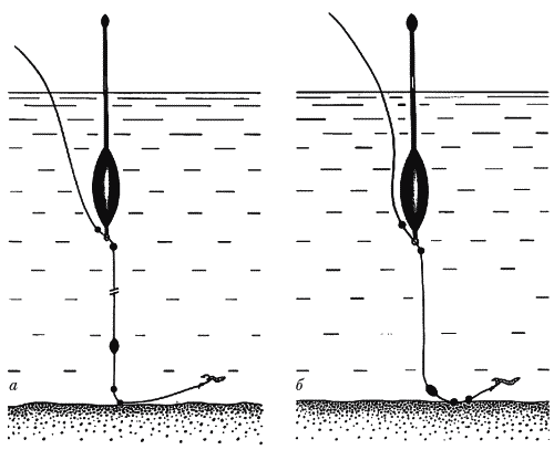 Соответственно он применяется при сильном дрейфе. Вытянутое, овальное тело поплавка находится под водой, над которой возвышается утолщенная антенна, обладающая высокой степенью плавучести. Огружают поплавок так, чтобы антенна возвышалась над водой только на 1–2 см. Дело в том, что лещ, имея широкое тело, располагается под углом к приманке и, втянув последнюю губами, приподнимает ее вверх. Поэтому либо антенна приподнимется над водой, слегка наклонившись в сторону, либо при хорошей поклевке весь поплавок ляжет на воду. Чтобы снасть так работала, ее необходимо тщательно взвесить в домашних условиях в глубоком сосуде с водой, тогда лещ не почувствует тяжести грузила. Существует огрузка с основным грузилом. В тихую погоду его поднимают выше, а во время сильной волны сдвигают ниже, к поводку (рис. 69). Рис. 69. Оснастка для поплавка Driftbeater: а – в тихую погоду; б – при сильной волне При ловле с дальним забросом нужно следить за сходом лески со шпули. Если первую немного придерживать пал