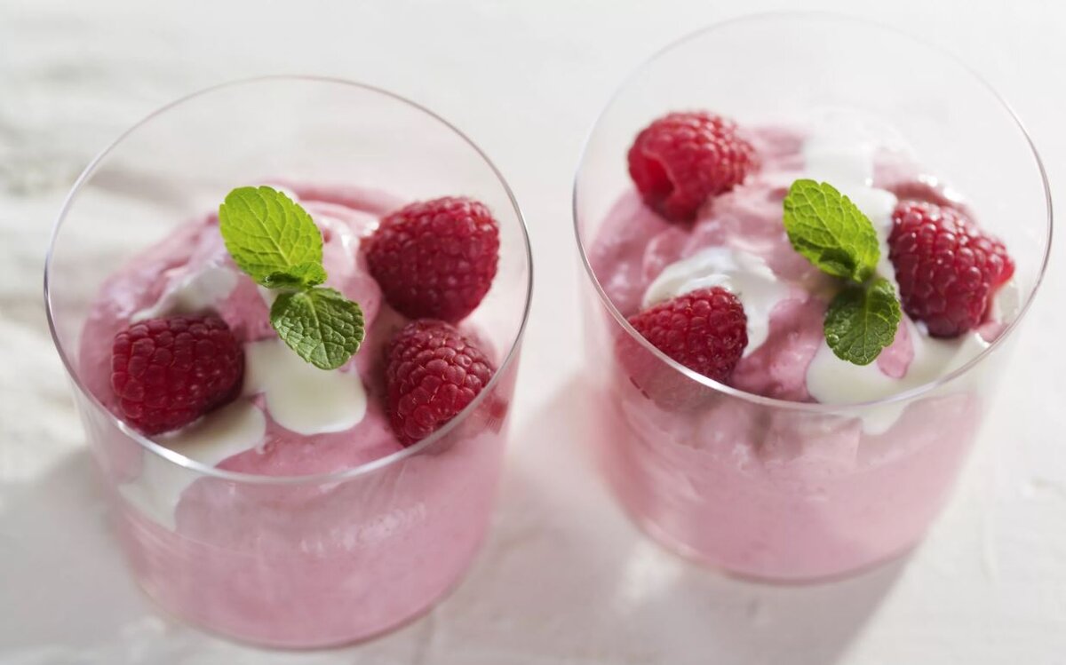 10 мин. время охлаждения 2 ч. 500 г замороженной малины несколько ягод свежей малины 2 веточки мяты 300 г натурального йогурта 100 мл сливок 3 пластинки желатина 2 ст. ложки мелкого коричневого сахара 1/4 ч. ложки ванильного экстракта 1. Малину предварительно разморозить. 2. Желатин замочить в холодной воде на 2–3 минуты. 3. Размороженную малину перемешать с сахаром и взбить блендером (можно пропустить взбитую массу через сито, чтобы избавиться от косточек). 4. Желатин прогреть на водяной бане, снять с плиты и соединить с малиной. Затем вернуть на огонь и прогревать до полного растворения желатина. 5. В йогурт добавить ванильный экстракт и перемешать с малиново-желатиновой смесью. 6. Сливки взбить и вмешать в малиновую смесь. 7. Разложить мусс по формочкам и поставить на 2 часа в холодильник. 8. Застывший мусс украсить свежей малиной и листьями мяты.