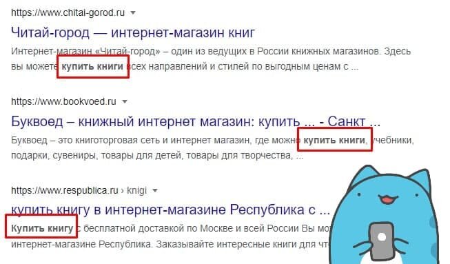 SEO-копирайтинг и ключевые слова — неразрывные понятия. Без одного не будет другого, а потому вы должны знать, как выглядят ключи и как их вписывать. Как работает поисковая система? Объясню на очень упрощенном примере, так как SEO-оптимизация — вещь сложная и с множеством нюансов, но база у нее одна. К примеру, вам нужно приобрести книгу. Вы так и пишете в поисковой строке, и вот система предлагает список сайтов: Что у них общего? Правильно, ваш запрос, а именно ключевая фраза или же просто ключ. 📢💭 Вот почему заказчики так злятся, когда вы отходите от ТЗ и вставляете не все вхождения. Ваша статья может быть литературна и прекрасна, но ее попросту не найдут через поиск. Как много нужно ключей на текст? Разбираем виды Так как вы не SEO-специалист, расчет количества ключей — не ваше бремя. Да, в идеале вы должны соблюсти правильное семантическое ядро, где на передовых местах будут ключевые слова в четких пределах частотности, но если этого нет в ТЗ, то и проявлять самодеятельность не с