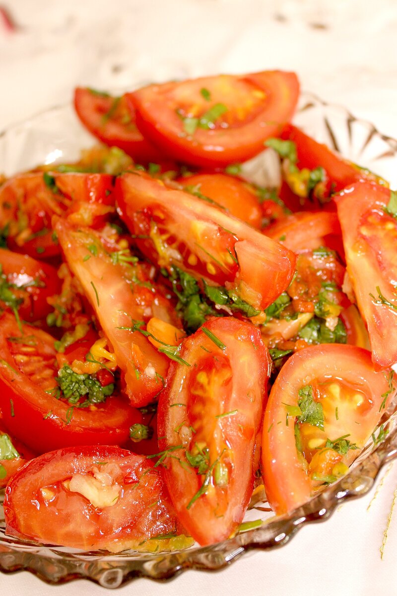 4 Залить подготовленным маринадом, закрыть крышкой и отправить в холод. Через 4 часа помидоры аккуратно перемешать, а через 8 часов их можно ставить на стол.