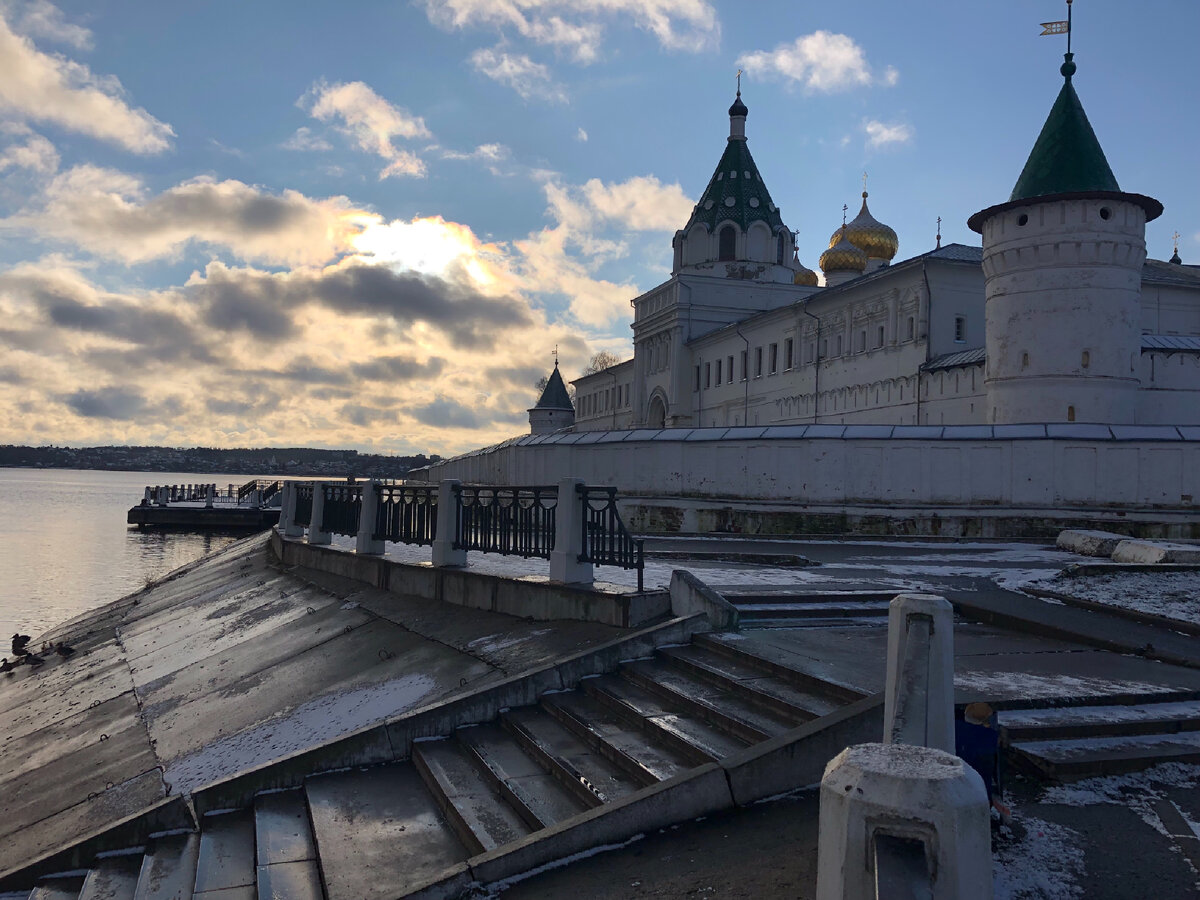 А ещё разглядываю шляпки Великих княгинь на фото. И изучаю живописные детали изразцовых печей💙 Сложно представить свой визит в Кострому без посещения Ипатьевского монастыря. И я мимо не проехала, конечно же. Раскинулся он на другой стороне Волги от центра города. Краткие факты из Википедии: Датой основания принято считать 1275 год, первое упоминание в 1432. Богатая история у этого места! Монастырь попал под покровительство Годуновых, на территории находится усыпальница рода. Это период процветания и богатства. В годы Смуты находился в руках сторонников Лжедмитрия ||. 14 марта 1613 в Троицком соборе монастыря был совершён обряд признания царем 16-летнего Михаила Романова, Смутное время закончилось. Монастырь считался «колыбелью Романовых» Вход на территорию мне перегородил охранник, который сказал, что сначала стоит купить билет. «Чтобы пройти на территорию монастыря??»-удивилась я. Видимо, далеко не первая удивилась. Он невозмутимо тыкнул в сторону кассы, над которой висела груда объ