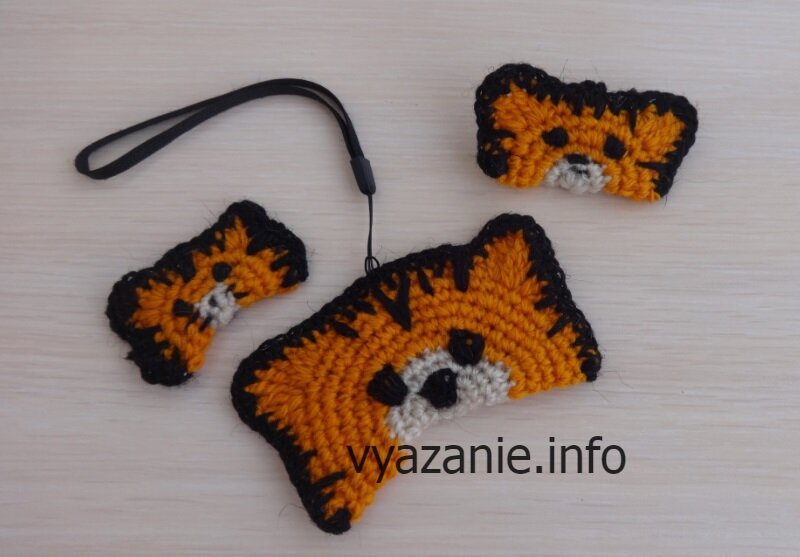 Тигрята, связанные крючком, милый подарок. К Новому году предлагаю связать тигрят. Посмотрите, какие они разные! Подарков хватит на всех. Тигрята брелки и новогодние игрушки Самые простые в исполнении брелки, магнитики, игрушки на ёлку. Вяжем круг, сначала белой пряжей, это будет мордочка, а потом продолжаем рыжим цветом. Размеры могут быть любые. Вышиваем глазки, нос, полоски. Я вязала крючком №3. Пряжа рассказовская ангорка. Описание. В кольцо амигуруми набираем 6 столбиков без накида. В каждом ряду прибавляем по 6 столбиков без накида. То есть, в одну петлю вяжем 2 столбика. Сначала в каждую петлю, в следующем ряду через 1, потом через 2, через 3, и так далее. Цвет нити меняем в соединительном столбике последнего белого ряда. Вяжем круг нужного размера. Складываем его пополам и вывязываем ушки. Сначала несколько петель столбиками без накида. Затем в одну петлю вяжем полустолбик с накидом, столбик с одним накидом, столбик с 2 накидами. Во вторую петлю столбик с 2 накидами, столбик с