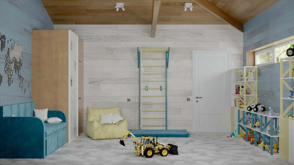 Хотите обновить мебель в игровой комнате мальчика, чтобы ему было достаточно места для игр и учебы? Вдохновляйтесь идеями на нашем сайте. Вся мебель может быть изготовлена под заказ. Игровая комната для мальчика оформлена в нежно-голубом и бледно-бежевом цвете. Зона хранения, зона для отдыха и творчества выделены голубым, а спортивная и учебная зона — спокойным бежевым. Ковровое покрытие простелено по всей площади комнаты для того, чтобы детям не было холодно в игровой комнате на первом этаже. Мягкая и деревянная мебель для мальчика окрашены в голубой и яркий желтый цвет. Стена в зоне отдыха украшена картой мира. Слева от входной двери установлена дизайнерская мебель, занимающая всю стену. В углах размещены 2 высоких стеллажа, а между ними — 1 низкий. Их отличает яркий цвет фасадов, перегородки и боковые стенки, выполненные в виде английской буквы «N». Под двумя окнами длинная деревянная столешница с белыми выдвижными ящиками, разделенная пополам тумбой с разноцветными фасадами. У каж