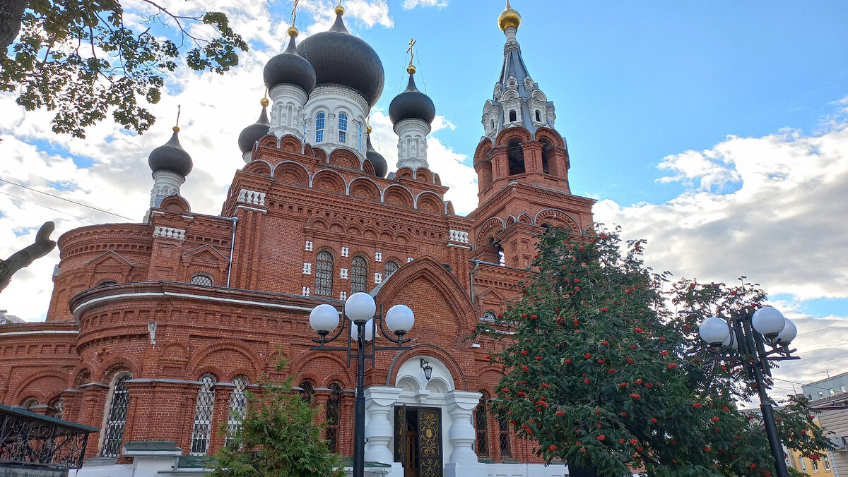 Не каждый турист оказывается в этом месте Нижнего Новгорода. Да и я оказалась здесь случайно. Привлекла красивая архитектура огромного храма и милый зеленый дворик с ярко-красными ягодами рябины. Пройти мимо было нельзя. Спасский храм расположен на улице Горького, 177А. Он возведен в честь спасения императора Александра III и его семьи при крушении поезда в 1888 году. Железнодорожная авария произошла, когда царская семья возвращалась из Крыма в Петербург. На полном ходу 10 вагонов сошли с рельсов. Погибли 21 человек и много людей было ранено. Вагон в котором находилась царская семья был полностью разрушен, но никто не пострадал. Это сочли чудом. На месте аварии неподалеку от Харькова, да и в других городах, стали возводить храмы, посвященные чудесному спасению императора. В конце 19 - начале 20 века при строительстве церквей был в моде псевдорусский стиль. При строительстве Спасской церкви в Нижнем Новгороде за образец выбрали Троицкий храм в московской усадьбе Шереметьевых - Останк