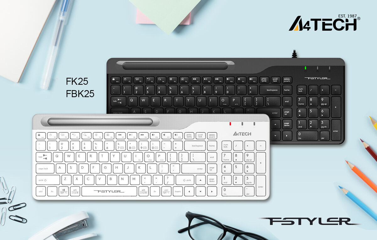 Компания A4Tech представила две новые клавиатуры из линейки Fstyler - FK25 и FBK25. Устройства интересны не только своими обтекаемыми формами и тонкопрофильным исполнением, но и завидной функциональностью. Для обеспечения мобильности пользователя и освобождения от проводов, FBK25 имеет беспроводной тип подключения с двумя режимами: по Bluetooth и радиоканалу с частотой 2,4 ГГц. Дизайн и функциональность Оба полноразмерных решения предлагают нетривиальный двухсекционный дизайн с полноценным NUM-блоком клавиш, а в верхней части над основной раскладкой клавиш вынесено специальное углубление, в которое можно установить смартфон или планшет с диагональю до 6,8”. Удобно, если пользователю необходимо часто мониторить входящие сообщения и выводить на своеобразный мини-экран дополнительную рабочую информацию. В остальном Fstyler FK25 и FBK25 довлеют к классическому облику офисных клавиатур, но все же выглядят интереснее за счет клавиш с закругленными краями и дополнительной цветной панели в ком