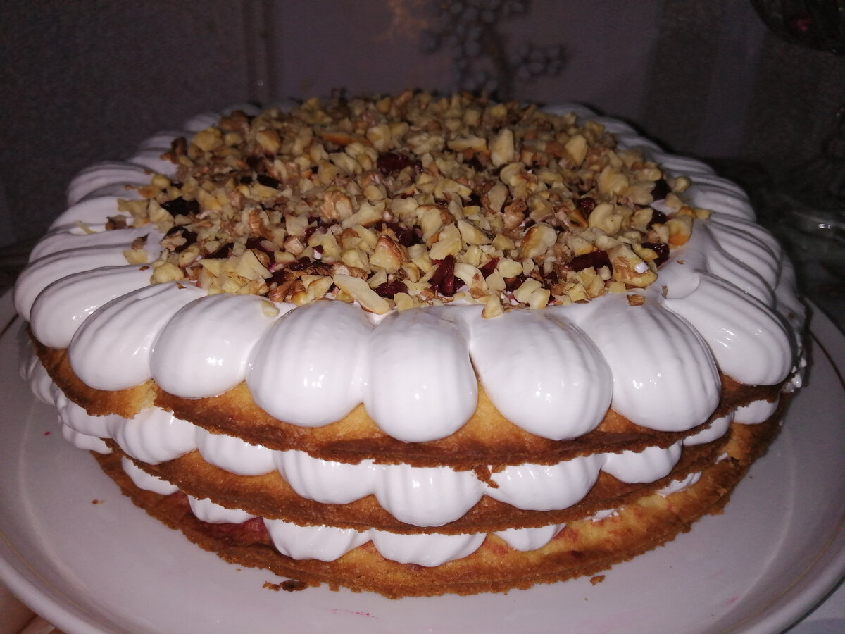 Идею торта я взяла в рецептах Дарии Цвек, знаменитого украинского кулинара. Песочные коржи, вишня, грецкие орехи и белоснежный белковый крем - очень вкусный домашний торт! Здравствуйте, друзья! С вами Светлана и "Мой кулинарный журнал"! Торт, рецепт которого я сегодня предлагаю, выглядит очень красиво и ярко, поэтому его можно приготовить не только для домашнего чаепития, но и для любого праздника, в том числе и для Нового года. Давайте приготовим! 1. Начинаем с теста. Яйца разделяем на белки и желтки. Для теста нам понадобятся только желтки, а белки пойдут в крем. Белки пока отправляем в холодильник. 2. Масло нужно заранее достать из холодильника, чтобы оно согрелось. Масло и сахар соединяем в миске и растираем при помощи миксера. Добавляем по одному желтки и смешиваем до однородной массы. 3. Муку смешиваем с разрыхлителем и небольшими порциями подмешиваем. Тесто собираем в комок. Оно получается мягким и рассыпчатым. 4. Тесто делим на три части, каждую слегка округляем, прикрываем п