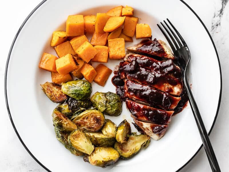 Ингредиенты: Жаренные овощи: Куриная грудка запеченная с травами: Клюквенный бальзамический соус: Пошаговые фото по готовке))) Разогрейте духовку до 200ºC. Вымойте 450-500гр брюссельской капусты и разрежьте ее пополам. Очистите и нарежьте кубиками сладкий картофель как на фото. Выложите их на большой противень, держа каждый на своей стороне. Сбрызнуть 2 столовыми ложками оливкового масла и приправить по чайной ложки соли и перца. Добавьте ¼ чайной ложки чесночного порошка только к брюссельской капусте. Перемешайте овощи, держа их отдельно, пока они не покроются маслом и приправой. Переложите в разогретую духовку и запекайте 15 минут) Пока овощи запекаются, приготовьте маринад с травами. В небольшой миске смешайте 2 столовые ложки сливочного масла комнатной температуры, ½ чайной ложки сушеного шалфея, ¼ чайной ложки сушеного тимьяна, ⅛ чайной ложки порошка чеснока и чайной ложки соли. Смешайте их вместе, пока не образуется паста из пряностей и масла.))) Положите две куриные грудки без