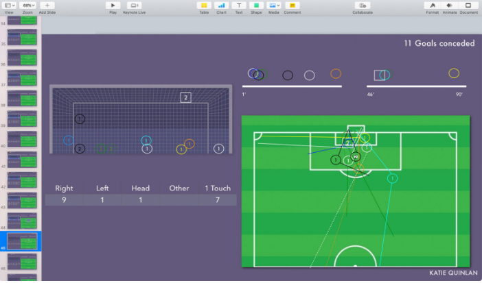 Вывод Hudl Sportscode, показывающий, какая часть голов была забита и с какой позиции на поле.