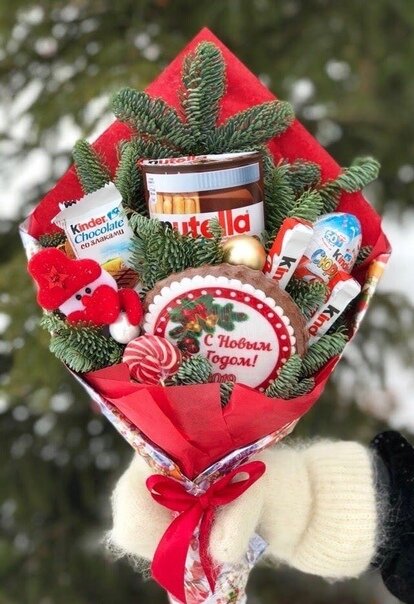 Приветствую всех прожорливых мышек и изобретательных котиков, кто заглянул в мою творческую статью! Нооовый год к нам мчится! А что мы попросим у Деда Мороза? - Пощады! В этом году особенно хочется настоящего праздника, как раньше, как в детстве! Так что я продолжаю бороздить просторы интернета в поисках супер идей для вас! И тут мне на глаза попалось чудо новогоднее - букеты из конфет, фруктов и сладостей! Я прямо обалдела- почему мне раньше в голову такие идеи не пришли? Ведь из еды букеты я делала - колбаса там да всякое. Из конфет тоже, а вот на новогоднюю тему не додумалась! Так что даю вам наводку на такое замечательное оформление подарка! Все фото взяты из открытых источников, я не претендую на их авторство! Статья для ознакомления! 1.Букет с Нутеллой. Не знаю, как вы, а я очень люблю Нутеллу! И ни с какой другой пастой ее не сравнить! Кстати, если она туго намазывается на хлеб после холодильника- просто поставьте ее в горячую воду на пару минут. 2. Букет из киндеров. А помнит