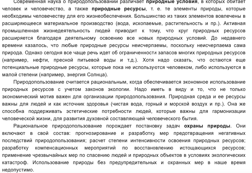 Современная наука о природопользовании различает природные условия, в которых обитает человек и человечество, а также природные
