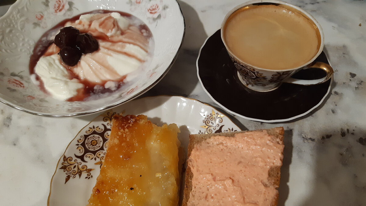 на #завтрак у нас творог, купленный в Дикси, с домашним вишневым вареньем. Доедаем последние кусочки лимонного пирога. Еще и хлебцы намазали деликатесной икрой с лососем (все, доели банку)