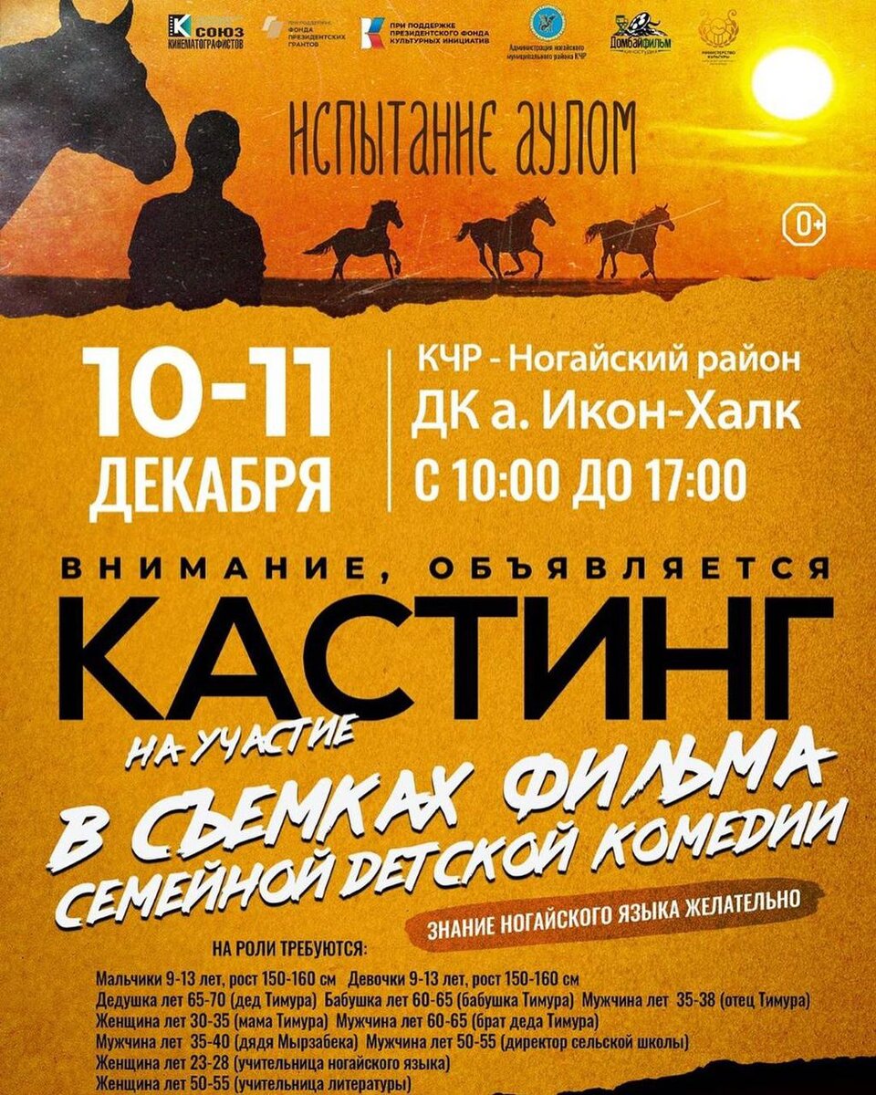 Он отметил, что кастинг будет проводиться 10-11 декабря на базе ДК а.Икон-Халк, Ногайского района, Карачаево-Черкесии. Знание ногайского языка желательно.