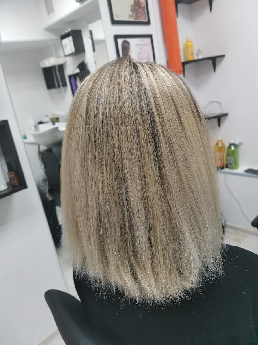 Клиентки с такими густыми при густыми, супер-густыми волосами у меня еще не было на растяжке. Моя гостья записалась почти на вечер. Если учитывать густоту волос мы справились быстро. Окрашивание длилось 5,5 часов. Это очень быстро для таких волос. А еще Для airtouch нам необходимы были слои, которых не было вот слова совсем. Пришлось создавать слои слайсингом. Итак, что мы имеем? Угт моей клиентки 5.0, корни отросшие почти 2,5 см, по полотну 8.3, концы декапированные. Красилась ранее моя гостья Estel на 9 угт+9% оксид. На концах когда то было мелирование. Алгоритм действий. Выполняем растяжку. 1. Набор на фольгу+слайсинг каждой пряди. Искусственно создаем слои. 2. Прокрашиваем промежутки. 5.1+ЗК+3% 3. Глубокий восстанавливающий уход. 4. Предпигментация. 0.43+1.5%+пена. Нейтрализация. 0.88+1.5%+пена 5. Тонирование 10.8(Picasso)+9.13(Picasso)+0.88(Londa)+0.98(CD)+1.5%+пена И все же я считаю, что лучше пусть волосы будут густые, чем тонкие. Я очень хотела подстричь концы, так как изнач