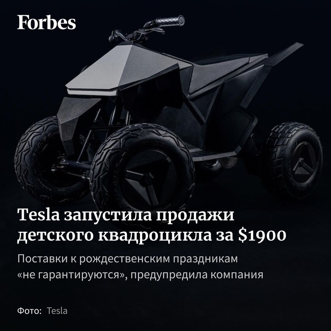 Tesla, основанная миллиардером Илоном Маском, запустила продажи квадроцикла для детей в возрасте от 8 лет под названием Cyberquad for Kids. Новый продукт появился на сайте Tesla 2 декабря, его цена — $1900.