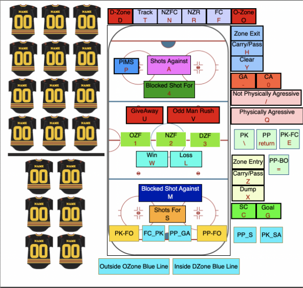 Окно кода Sportscode, которое Эндрю использует для записи событий во время матчей в прямом эфире на льду.