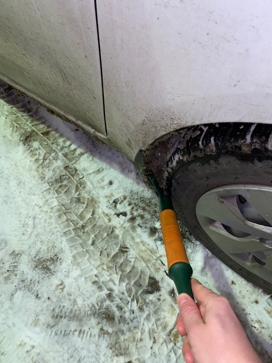 Решил сегодня затронуть вот какую интересную, а с другой стороны очевидную историю: Чистка брызговиков от снега после поездки перед ночным простоем в зимнее время. Какое-то сложное получилось предложение, но я считаю, это делать строго необходимо. Очень не завидую тем людям, кто про это забывает или кому всё равно и он совсем не бережет свой автомобиль. Особенно грустно видеть, как эти машины выезжают из двора и поворачивают, а колесо чуть ли не вырывает в этот момент брызговики и подкрыльники. Ведь самое неприятное это то, что когда всю эту грязь ты собираешь на дороге и ездишь, она мягкая талая и рассыпается. НО зато когда эта грязь остается на ночь на брызговиках, она предательски замерзает и становится колом или той самой палкой, которую втыкают в колеса. Поэтому я придумал как с ней бороться. Да можно пинать ногами брызговики, вариант имеет место быть, но ваши туфли или белые кроссовки сразу станут черными. Я использую щетку для уборки снега той стороной, что все мы безбожно с