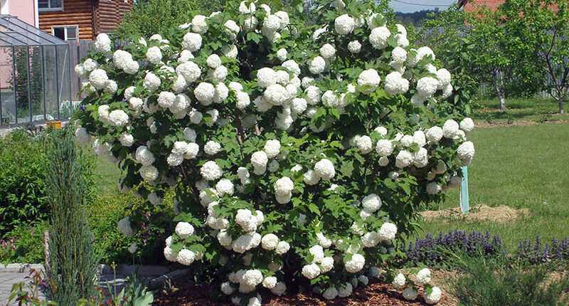 Калина сорт Бульденежна: Кустарник в высоту достигает 3,5 м. Имеет раскидистую, пирамидальную крону. Побеги светло-зеленые, покрыты густыми, просвечивающими серебристыми волосками. Почки продолговатые, лировидно зазубренные. Листья имеют густую, пластически-выпуклую структуру с волнистой перемычкой и загнутым зубчиком по краям. Они темно-зеленого цвета, осенью приобретают бронзовый оттенок. Оттенок может меняться в зависимости от освещения. В течение лета листья меняют свою окраску дважды – весной и осенью. Цветки воронкообразные, собраны в кистевидное соцветие. Они светло-розовые, по величине соразмерные. Цветение происходит в июне. Плоды созревают в сентябре. Вегетационный период составляет 90 дней. Плодоношение продолжается с июля по октябрь. Крона двудомная. Цветет в июне-августе, плодоносит в сентябре-октябре. В природе калина растет в хвойно-широколиственных лесах, оврагах, на остепненных землях. Ее вегетация продолжается около 4-х лет, но калина вырастает всего за 4-5 лет. Калин