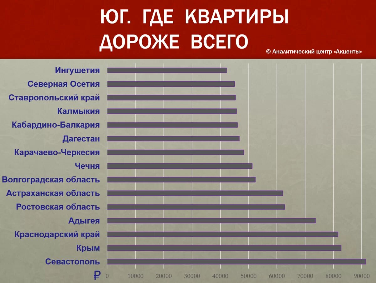 Следом за Севастополе по стоимости жилья идет Крым, где "квадрат" будет стоить 82,7 тыс рублей. И это на 40% дороже, чем сейчас. Стремительно взлетит цена на недвижимость и в Краснодарском крае - с 51,5 до 81,6 тыс рублей за "квадрат". Или почти на 60%.