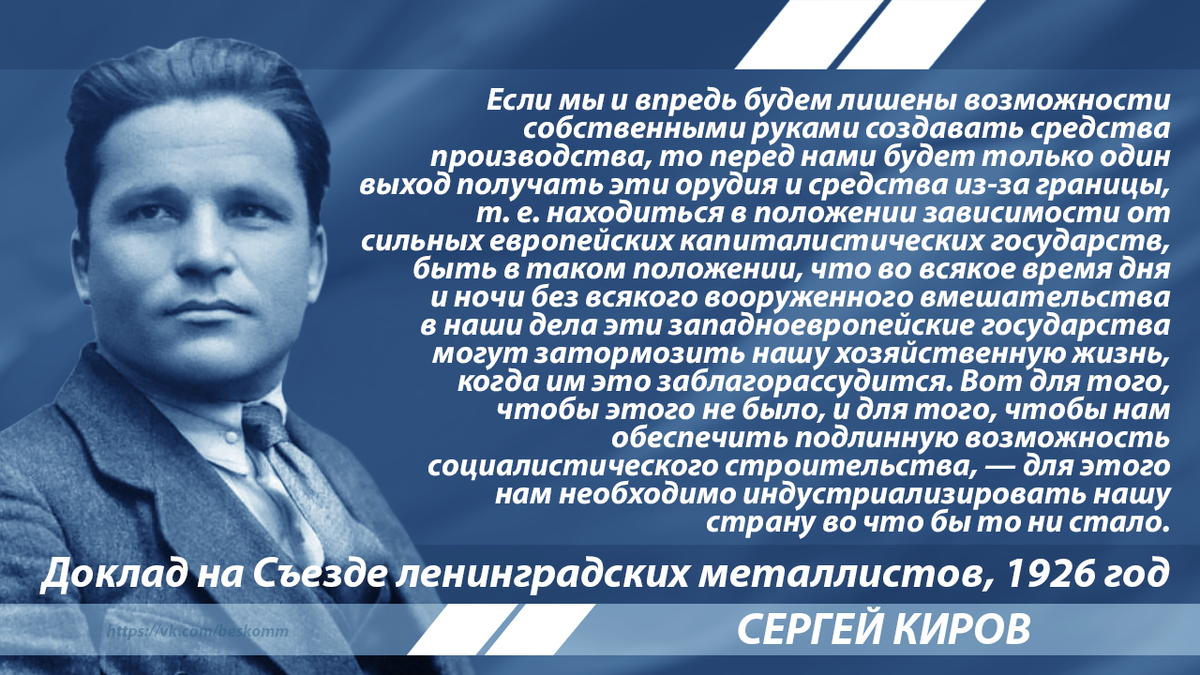 Сергей Миронович Киров (1886 — 1934) - советский партийный деятель, коммунист, революционер, член РСДРП(б) с 1904 года. Убит в 1934 году в Ленинграде. Совершает ошибку тот, кто думает, что мы с нашим врагом — империализмом Западной Европы — ведем войну только вооруженной рукой, только вооруженной силой. Нет, это не так, — во всех областях нашей жизни мы находимся на военном положении.