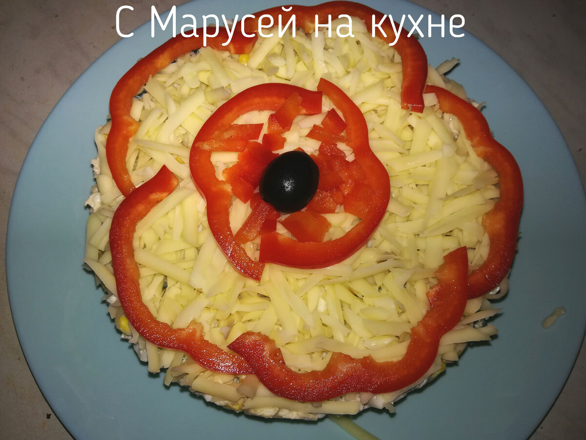 Доброе утро всем кто зашёл на мою страницу!!! Меня зовут Марина, и я очень рада всем вам!!! Сегодня я хочу рассказать Вам рецепт куриного салата в котором минимум ингредиентов, а готовится он очень легко. Такой салат можно подавать на Новогодний стол, или порадовать Ваших гостей. Нам понадобятся следующие продукты : ФИЛЕ КУРИНОЕ - 350 ГРАММ ЯЙЦО - 4 ШТУКИ ОГУРЕЦ СВЕЖИЙ - 1 ШТ. ДЛИННЫЙ КУКУРУЗА - 200 ГРАММ МАЙОНЕЗ - 3 СТОЛОВЫХ ЛОЖКИ СОЛЬ - ПО ВКУСУ ПЕРЕЦ ЧЁРНЫЙ МОЛОТЫЙ - ПО ВКУСУ СЫР ТВЁРДЫЙ - 50 ГРАММ ПЕРЕЦ СЛАДКИЙ - ДЛЯ УКРАШЕНИЯ Промываем куриное филе и ставим на плиту. Доводим до кипения, снимаем накипь и оставляем вариться до полной готовности, примерно 30 минут. После этого вынимаем куриное филе из бульона и даём ему остыть. На получившемся курином бульоне, можно приготовить суп. Отвариваем яйца до готовности. Затем полностью остужаем их. Моем и обсушиваем свежий огурец и болгарский перец. Режем куриное филе некрупными кусочками и перекладываем в салатник. Добав