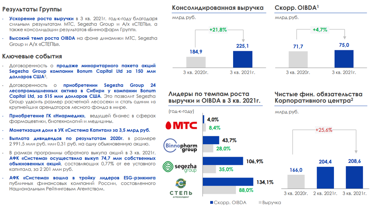 Выручка компании выросла на 21,8% по сравнению с аналогичным периодом прошлого года – до 225,1 млрд руб. Основной вклад в выручку внесли такие активы, как Агрохолдинг Степь, Группа МТС, Группы Бинофарм и Сегежа. Скорректированный показатель OIBDA увеличился всего на 4,7% – до 75 млрд руб. на динамику OIBDA Системы в III кв. 2021 г. повлияло отражение доли Группы в увеличении чистого убытка Ozon на 2,9 млрд руб. с 1,6 млрд руб. в III кв. 2020 г – до 4,5 млрд руб. в III кв. 2021г., а также эффект от продажи доли в Детском мире в III кв. 2020 г. на 3,7 млрд руб. Несмотря на рост основных показателей, чистая прибыль Системы упала почти на 62% – до 888 млн руб. Скорректированная чистая прибыль на начисления, связанные с LTI программой дочерних компаний составила 2,3 млрд руб. против 2,6 млрд руб. за аналогичный период прошлого года. Выкуп акций АФК Системы Группа сообщила, что в III кв. 2021 г. выкупила 74,7 млн обыкновенных акций на 2,2 млрд руб. – это 0,77% от уставного капитала компании.
