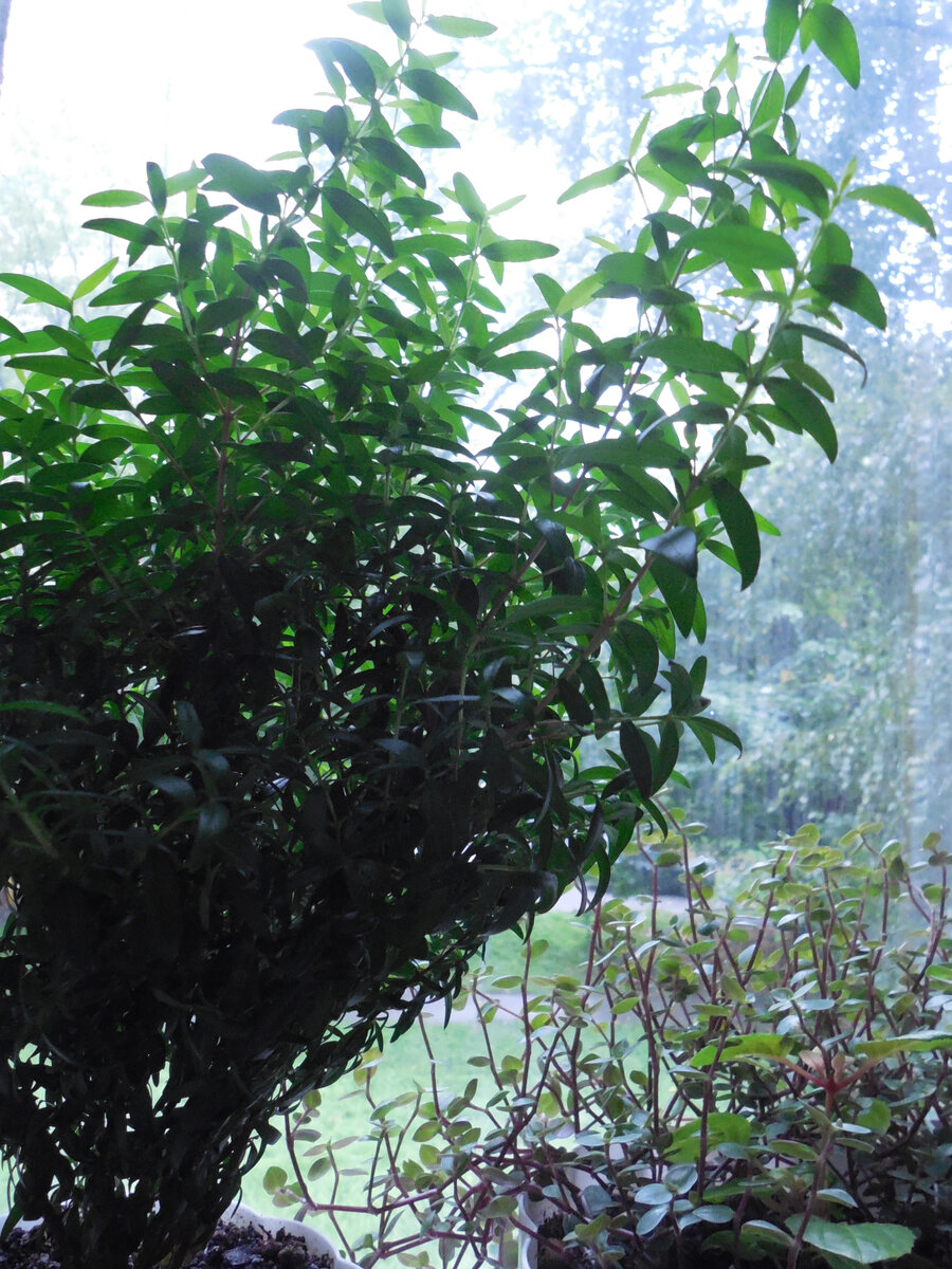 Мирт чуть старше. Золовка холила и лелеяла. Несколько лет. А так как я укоренила не черенок, а вполне полноценный воздушный отводок с веточками нескольких порядков, мирт ещё и зацвести успел! Хозяйка к уходу приноровилась, никаких проблем!