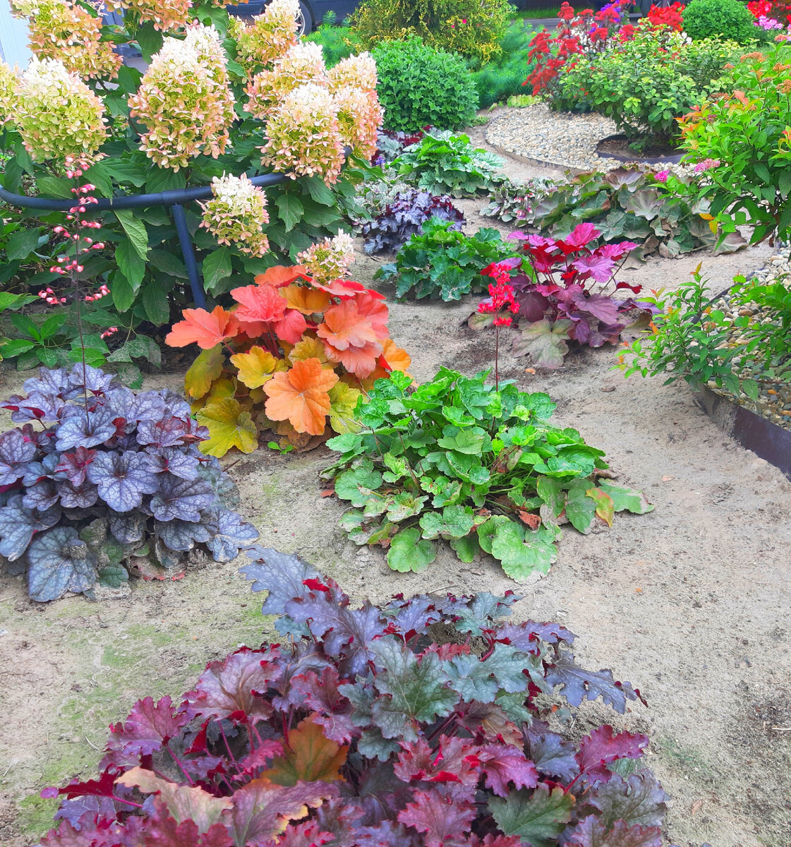 Территория газона у меня с теневой стороны засажена метельчатыми гортензиями, в подножии которых разноцветным ковром живут geuheri.