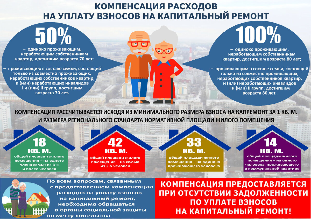 В Воронежской области продлили до 31 декабря 2024 года действие дополнительной меры социальной поддержки граждан, достигших возраста 70 и 80 лет. Пожилые собственники помещений в многоквартирных домах по-прежнему смогут получать компенсацию части расходов на уплату взносов на капитальный ремонт. В частности, компенсация расходов на уплату взноса на капитальный ремонт, рассчитанная исходя из минимального размера взноса на капитальный ремонт на 1 кв. м. общей площади жилого помещения в месяц и размера регионального стандарта нормативной площади жилого помещения, используемой для расчета субсидий на оплату жилого помещения и коммунальных услуг, установленного в Воронежской области, предоставляется гражданам ежемесячно в следующих размерах: При наличии у гражданина в собственности нескольких жилых помещений в многоквартирных домах компенсация предоставляется в отношении одного из таких жилых помещений, расположенных на территории Воронежской области, по выбору гражданина. Компенсация расхо