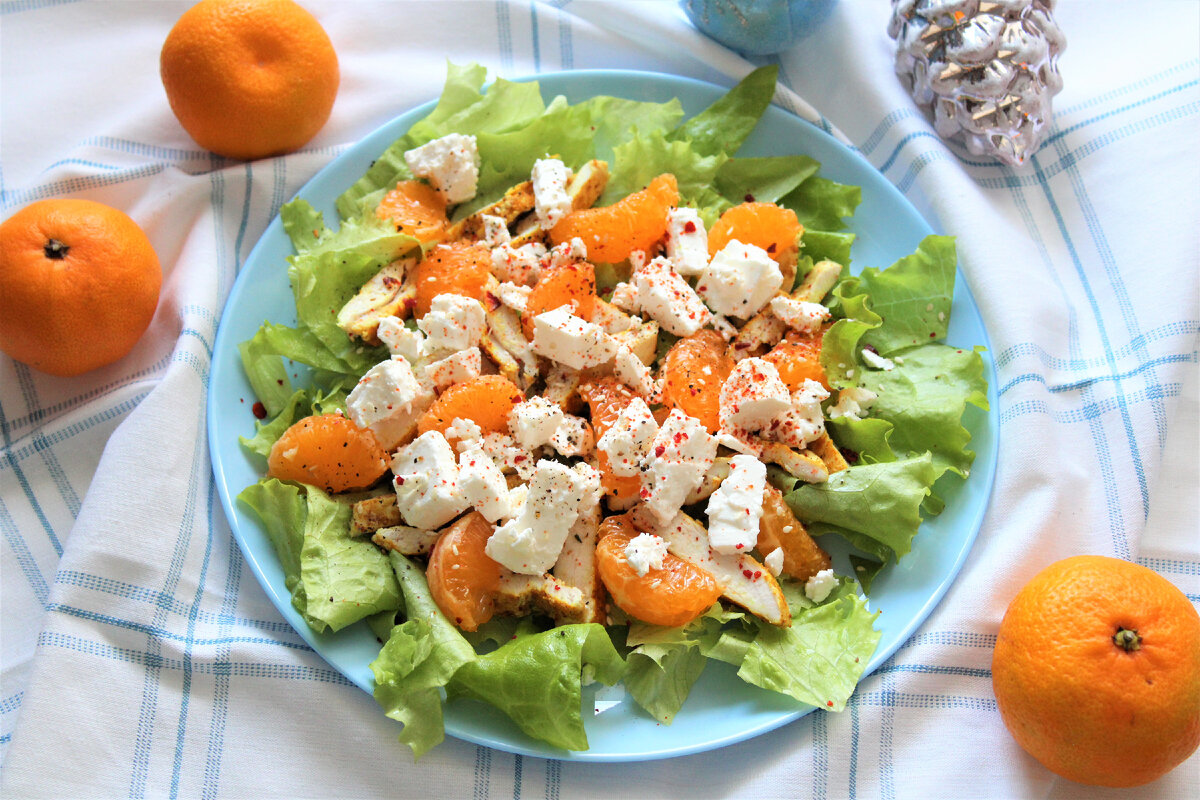 Оригинальный праздничный салат для новогоднего стола. Свежий, вкусный и простой в приготовлении. Все мы обожаем наши горячо любимы майонезные салаты такие как Мимоза, селедка под шубой и, конечно, Оливье. Но почему бы не поэкспериментировать и не удивить гостей? Салат "Мандаринка" как нельзя кстати для этого подходит. Свежий, с неповторимым вкусом и легкий, что не мало важно для новогодней ночи. Да и выглядит он очень нарядно и аппетитно, согласитесь... Сначала подготовим куриную грудку. Ее нужно нарезать тонкими пластинами и немного отбить. С двух сторон посыпать солью, сухим чесноком и паприкой. Затем мясо нужно обжарить в течение нескольких минут с двух сторон, главное не пересушить. А пока грудка подрумянивается на сковороде можно очистить мандариновые дольки от кожицы. Готовое и немного отдохнувшее мясо нарезаем на полоски или кубики (как угодно) и начинаем собирать салат. На тарелку для подачи выкладываем промытые и высушенные листья салата