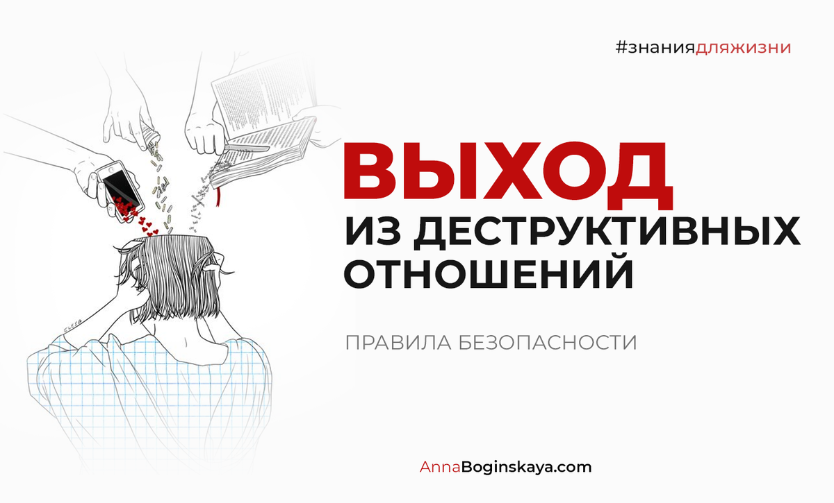 Очень часто отношения с манипуляторами вводят нас не только в психологическую, но и в физическую зависимость. Выход из таких отношений требует от вас сил, инвестирования действий в этот процесс. Правило №1, когда мы выходим из деструктивных отношений, - это полная информационная блокада. Манипуляторы извращены в своих техниках. Они способны выставлять в соцсети жалостливые стишки, многозначительные цитаты великих о страданиях и любви. Каждая жертва думает, что это о ней. А на самом деле, манипулятор так пишет для всех, кто первой попадется на его «крючок». Часто вы думаете: «А, может, это он только со мной такой, с другими он ведет себя иначе?». Это не так. В конфетно-букетном периоде он точно так же, как и с другими, находится «в подстройке», а через некоторое время новая жертва будет находиться в таком же состоянии, в котором находились вы. Если вы расстались, очень важно соблюдать правила безопасности: Все это нужно сделать для того, чтобы, следуя механизму вытеснения, через некотор
