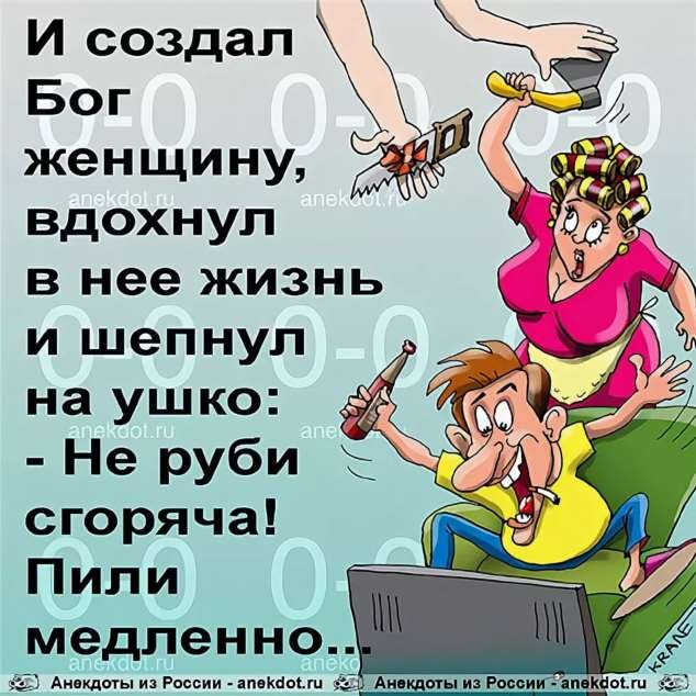 На свадьбе свидетельница заявила: — К сожалению, я совсем не знаю жениха, и поэтому я не могу поздравить невесту. Но я очень хорошо знаю невесту, и поэтому не могу поздравить жениха... Деревня. Дом. К дому подбегает мужик: — Пахом, а Пахом! На твою тещу собаки напали. — Сами напали, пусть сами и отбиваются! Отец озабоченно поглядывает в окно: — Мама вышла на улицу без зонтика, а смотри, какой дождь пошел… — Не волнуйся, папа, она в магазин забежит. — Вот именно этого-то я и боюсь… Едет в троллейбусе женщина с ребенком. Ребенок ведет себя безобразно. Вертится, ножками болтает, всех пачкает. Народ начинает возмущаться: — Женщина, утихомирьте своего сына. На что она встает и гордо заявляет: — Я своего ребенка воспитываю так, что ему можно все. Тогда с соседнего места поднимается здоровенный бугай, вытаскивает изо рта жвачку и радостно лепит ей на лоб: — И меня мама тоже так учила. Маленькая девочка купается в ванне. Мама ей говорит: