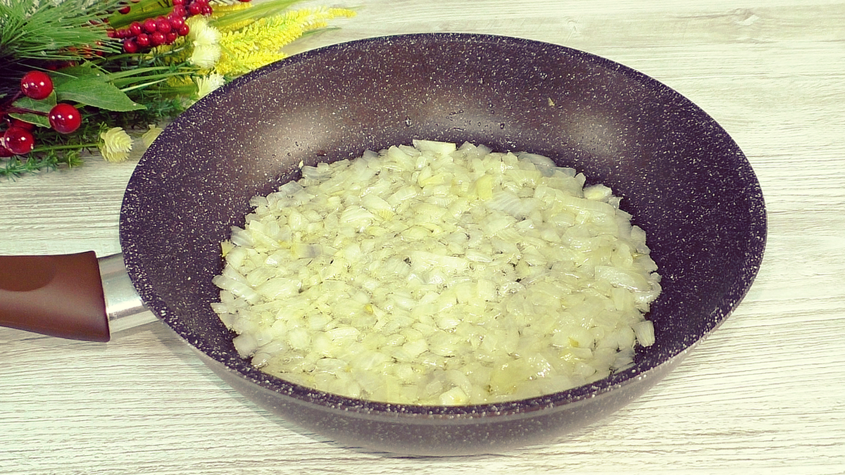 Сначала я обжариваю лук на растительном масле, до мягкости и прозрачности (не зарумяниваю) он потом с грибами ещё обжарится.