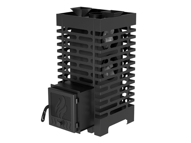 Полузакрытая круглая каменка в виде одной либо двух труб располагается на месте пламегасителя. Благодаря этому камни быстро прогреваются с минимальной потерей тепла. Вам потребуется немногим больше часа, чтобы подготовить парную для посещения.
