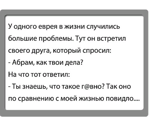 Приходит старый еврей в гастроном,смотрит очередь за сметаной,но на прилавке предупреждение:не для евреев.Он стал возмущаться