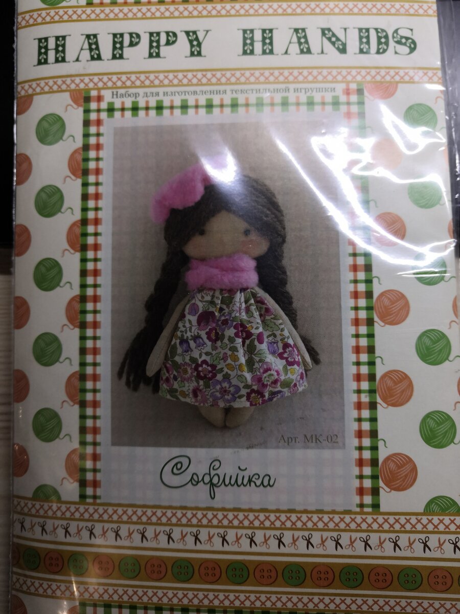 Доброго времени суток! Для разнообразия решила приобрести новый набор и попробовать сшить маленькую куколку Софийку от Happy Hands. В наборе хлопковая ткань для тельца и платья, флис для берета и шарфика, пряжа для волос, инструкция с выкройками, иголка, деревянная палочка для набивания, а также бусинки для глаз. После наборов от Art Uzor очень непривычно куколку делать из хлопка. Но хлопок мне очень понравился. И на машинке удобнее сшивать, и при набивании игрушка не растягивается. Только мнётся сильно, особенно после того, как выворачивала детальки. Но после набивания ничего мятого не остаётся. Сложно было выворачивать ручки, т.к. они довольно тонкие, поэтому брала палочку потоньше, а не ту, которая в наборе. Также при набивании игрушки обратила внимания, что палочка из набора обработана не очень хорошо. Можно легко получить занозу. Я подшлифовала палочку обычной пилочкой, это очень помогло - палочка быстро стала очень гладкой. При сшивании тельца с головой, воспользовалась длинными