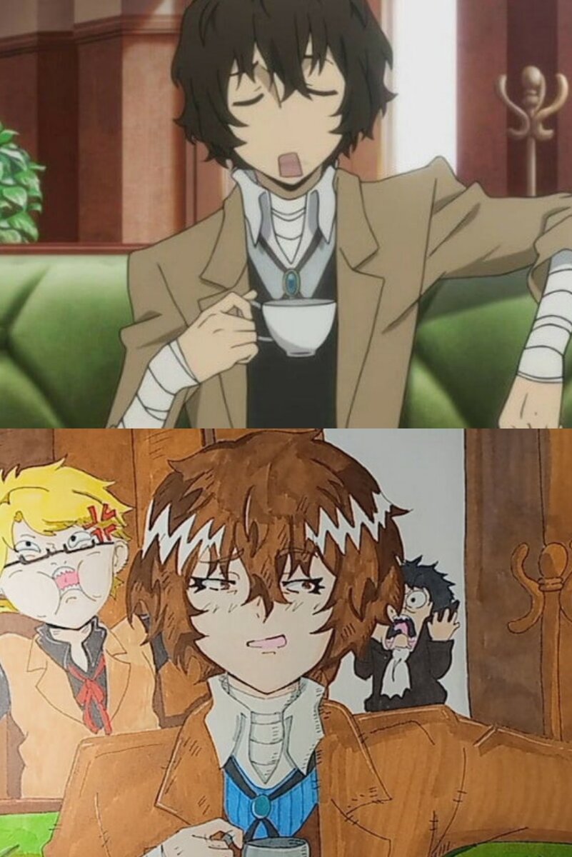 Всем привет! На связи Саймон! Собрала небольшое колличество своих перерисовок с аниме. // Если честно, то я считаю это наиболее ленивым занятием. Но редрайвы делаю, когда нет идей для рисования// 1. Кадр из аниме "Проза бродячих псов" Мой редрай Тут не получился фон :") поэтому это больше психоделическая мешанина🤔 2. Тоже кадр из аниме "псы бродячие" Мой редрайв Это должен был быть простой редрайв. Но потом меня понесло не понять куда... Не понять зачем. 😅 3. Кадр из "Симпсоны" Мне понравился момент один из сериала🤔, но мозг посчитал что не стоит его сохронять. Поэтому пришлось искать что то схожее. Мой редрайв〜(꒪꒳꒪)〜 Получилось очень ярко. Да плюс произошел проблемс с руками :").. но мне он так понравился°^°. Хоть там большие проблемы с бумагой 👉👈.. 4. Снова кадр из "бродячие псы" Ыть. Не очень люблю Чую, но мне нравится этот кадр. Мой редрайв¯\_(ツ)_/¯ Здесь не закончен фон. Да и в целом есть небольшие косяки. Вообще мне он не очень 😅 Бонус! 5. Это даже не редрайв