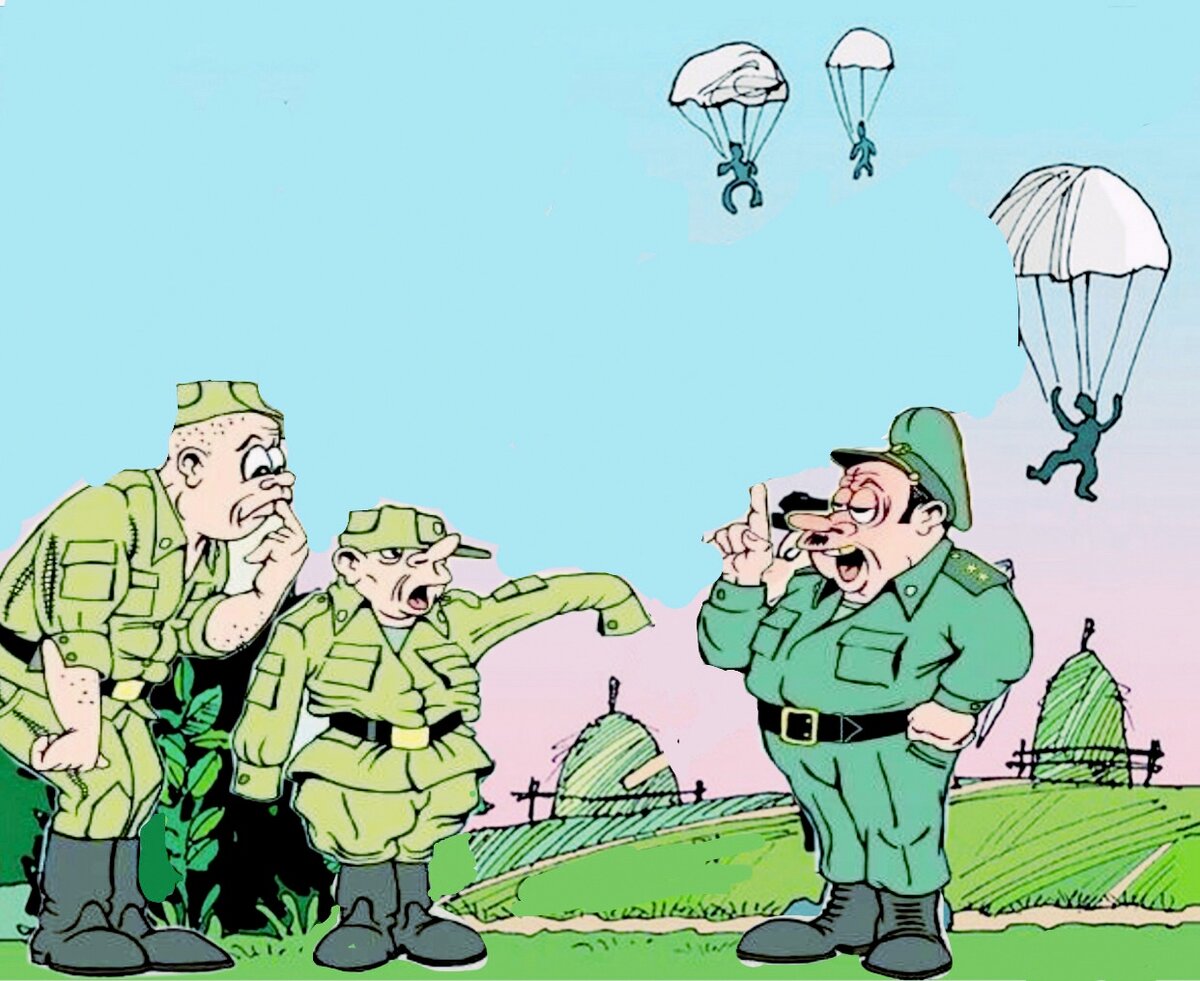 Приехали в армию новобранцы. Командир взвода водит их по полигону для ознакомления. Рядом проходит обучение по прыжкам с парашютом. Он говорит новичкам:
