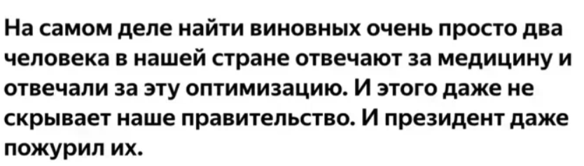Приветствую всех на своём канале! Для многих из вас уже не будет секретом то, что власть пытаясь оптимизировать здравоохранение полностью его разрушила. И то что случилось мы видим своими глазами. Но когда происходит из ряда вон выходящее должны быть виновные.