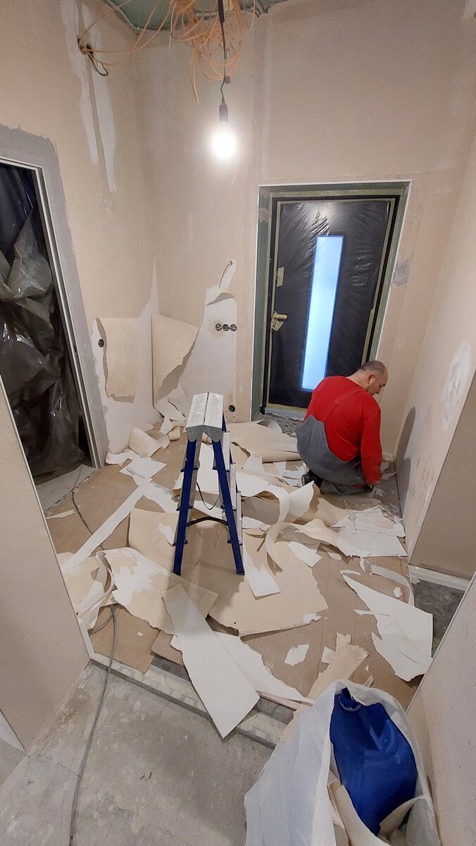 Сейчас во всех моих проектах давно используется механизированная штукатурка и я приглашаю давно проверенную бригаду, они работают быстро ,чисто и качественно. Обычно два ,три дня и квартира готова. В комнатах гипсовая штукатурка, в сан.узлах только цементная. Прошу всегда гипсовую штукатурку не заглянцовывать, чтоб поры были и заметил что сохнет так она быстрее и грунт хорошо проникает и адгезия лучше. Но я помню когда в 2017г. посетил семинар Knauf ,там говорили что если глянцевать ,то под обои это только плюс. Уходим от пыльных работ, так как не надо шпаклевать и шлифовать, а прогрунтовав грунтом кнауф можно сразу клеить обои. Не буду я вас долго мучить рассказом и поделюсь фактом и прикрепляю фото ,а выводы делайте сами. Прихожу на объект где надо покрасить стены. Прораб подготовил стены к покраске. Значит на заглянцованную штукатурку нанесли пуливизатором грунт кнауф и поклеили стеклохолст "паутинка" . Дальше в два раза отшпаклевали шитроком и шлифанули. Готово к покраске. Но я
