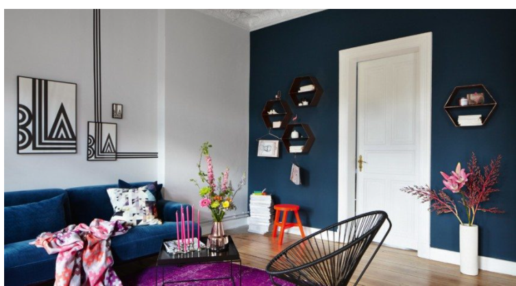 эффектно выделяется на фоне темно-синей стены